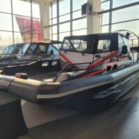Съемный ходовой тент с панорамными окнами надежно защищает от непогоды. Модель может быть оборудована еще двумя тентами: для защиты груза на передней платформе и стояночным тентом-палаткой, который полностью накрывает носовую часть лодки.