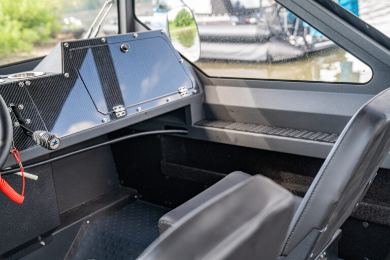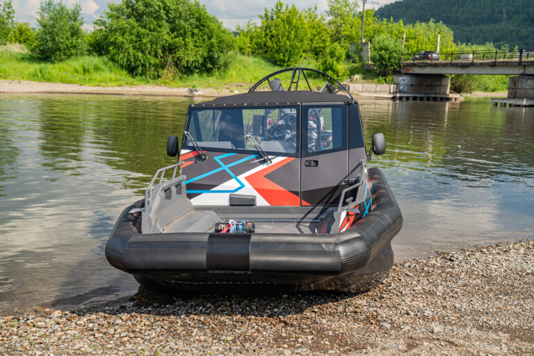 Съемный ходовой тент с панорамными окнами надежно защищает от непогоды. Модель может быть оборудована еще двумя тентами: для защиты груза на передней платформе и стояночным тентом-палаткой, который полностью накрывает носовую часть лодки.