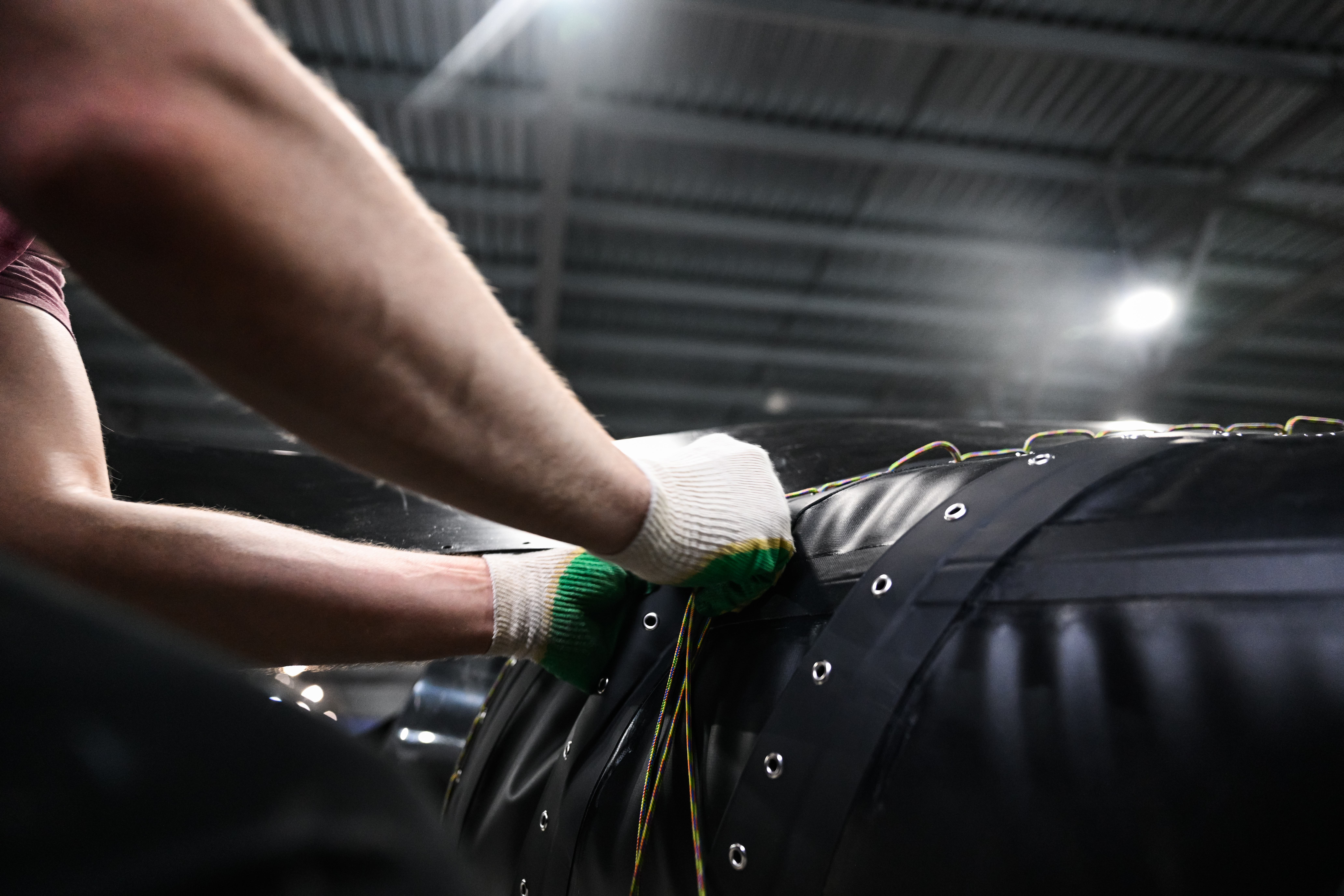 - Слегка спустите воздух из правого и левого силовых баллонов (диаметром 640 мм). Это облегчит дальнейшие манипуляции с крепежным шнуром и чешуей. Не спускайте баллоны полностью, чтобы корпус сохранял форму.