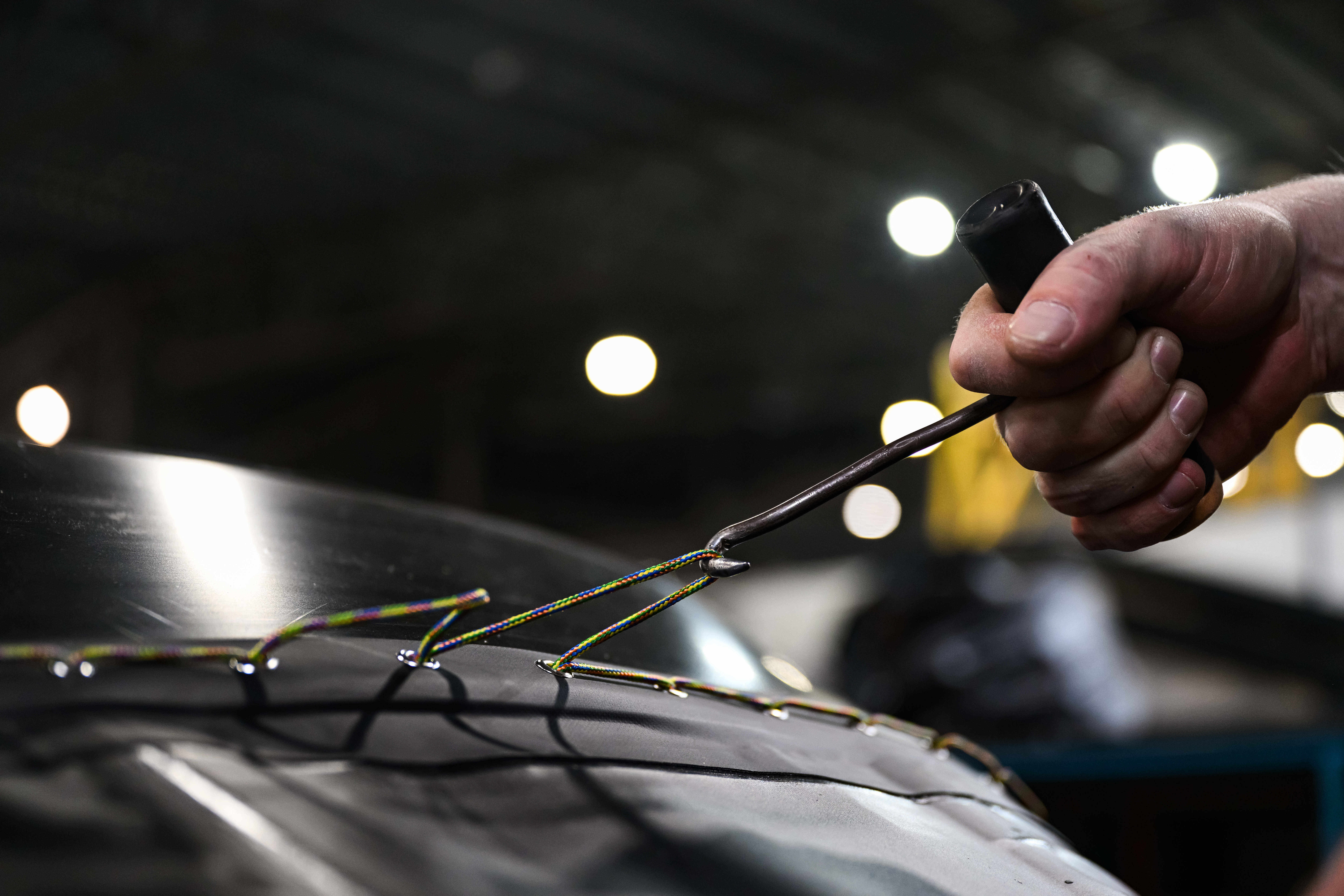- Расшнуруйте или срежьте удерживающий чешую крепежный шнур. Старайтесь не повредить люверсную ленту;