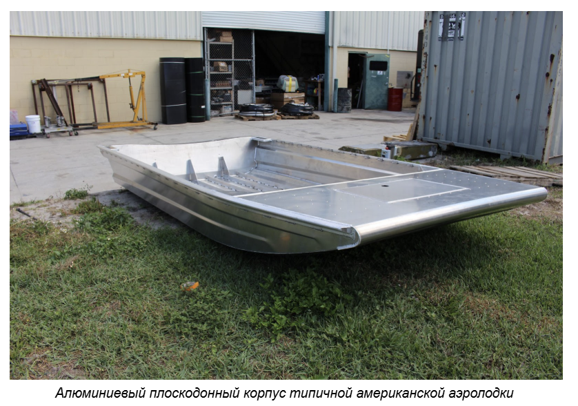 Типичная американская аэролодка представляла собой плоскодонный глиссер с низкими бортами и алюминиевым корпусом открытой конструкции, без киля и с широким плоским приподнятым носом, который часто называют «flat bow» или «square bow». Как правило, она не имела ни палубной надстройки, ни кабины — судоводитель сидел на возвышении для лучшего обзора, а перед ним (если лодка достаточно большая) располагались в один или несколько рядов пассажирские сиденья, также приподнятые над палубой. Плоскодонный корпус минимизировал контакт с поверхностью, а заниженный центр тяжести обеспечивал неплохую остойчивость.
